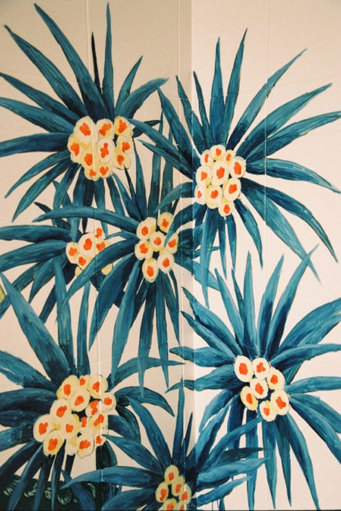Pair of murals in the male and female changing rooms. Recreation of a jungle area with birds and leopards, flowers, palm trees and plants.