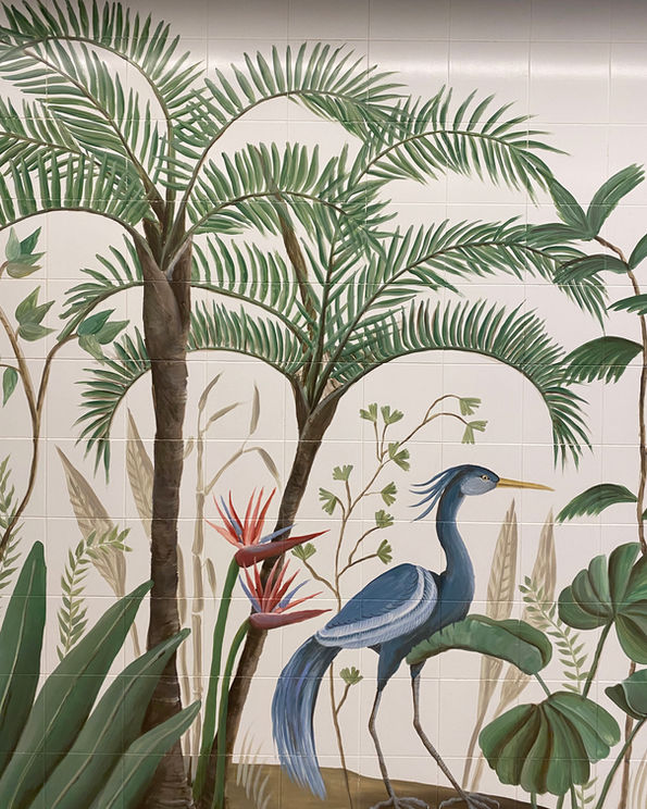 Proyecto de ilustración mural sobre azulejo actual de un baño antiguo. Se pintó el azulejo viejo con pintura especial, y después de realizó el mural, pintado a mano con pintura acrílica y chalkpaint. La intención fue emular un paisaje tropical con flores, plantas, palmeras y aves exóticas.