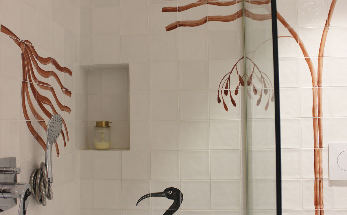 A minimalist artwork that blends elegance and character. The design features birds and a blue leopard, crafted in a refined palette of terracotta, black, and blue. Each tile was hand-painted and fired in a special kiln, resulting in a truly unique finish. Installed in the bathroom of a private residence, this mural seamlessly integrates art and architecture into a single space.