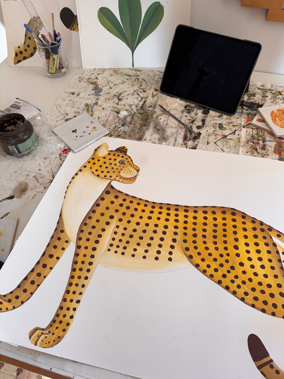 Mural pintado a mano en una residencia privada situada en el corazón del barrio histórico del Carmen, en Valencia. Este mural se encuentra en una zona de paso que conecta el salón-comedor con la zona privada de la vivienda, integrando el arte en la circulación cotidiana del hogar. El diseño combina elementos geométricos, como prismas y ondas de agua, con motivos figurativos, como un leopardo y vegetación tropical. La paleta cromática fue cuidadosamente seleccionada para armonizar con los colores actuales de la vivienda, recientemente restaurada, creando una continuidad estética entre el mural y el espacio interior.